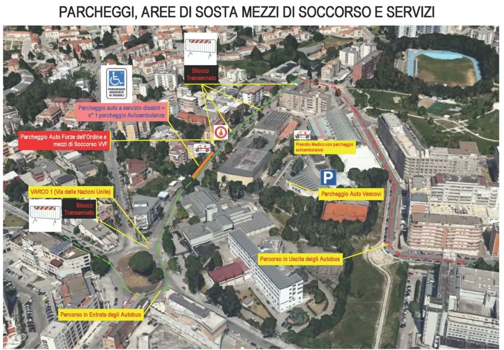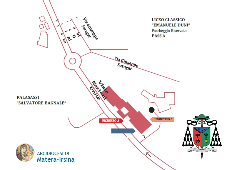 - la sospensione della circolazione veicolare, dalle ore 13:00 alle ore 19:00 e comunque fino a cessate esigenze, in Viale Nazioni Unite e strade adiacenti, tratto compreso tra via A. Moro (Rotatoria Pino) e via Saragat, eccetto autobus dei fedeli, veicoli dei residenti, proprietari e detentori di garages e/o aree private, delle autorità civili, militari e religiose che prenderanno parte alla cerimonia religiosa e quelli in possesso di Pass “A” rilasciato dall’Arcidiocesi Matera-Irsina;