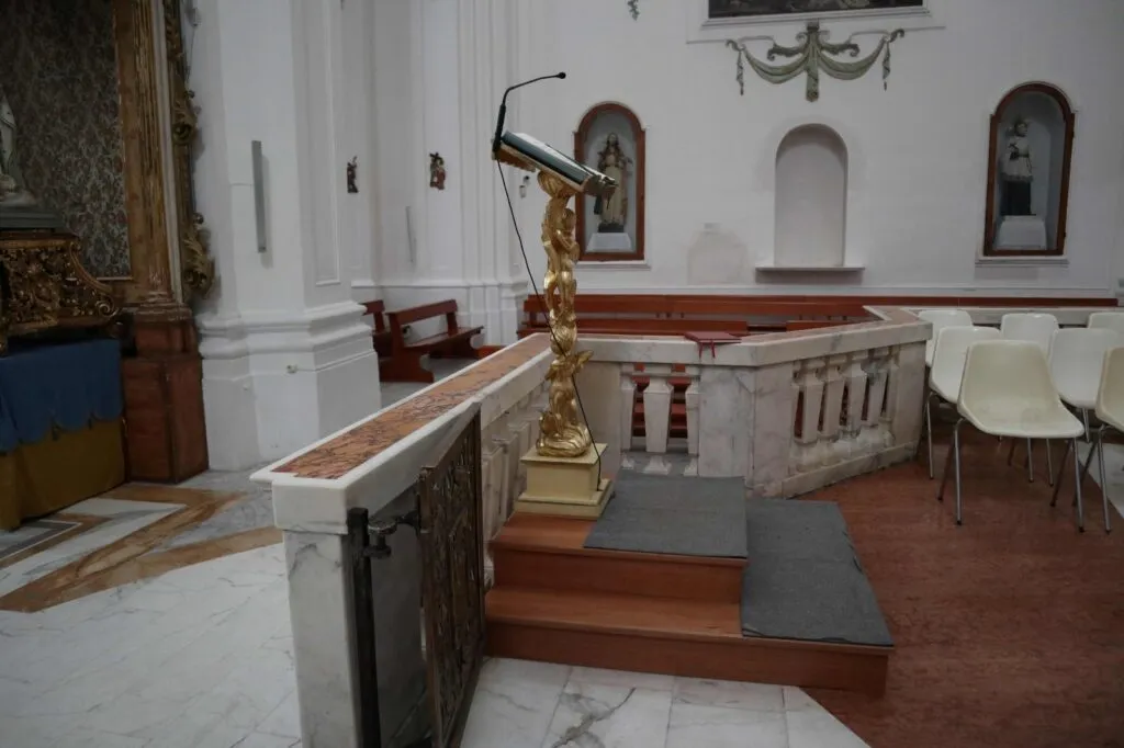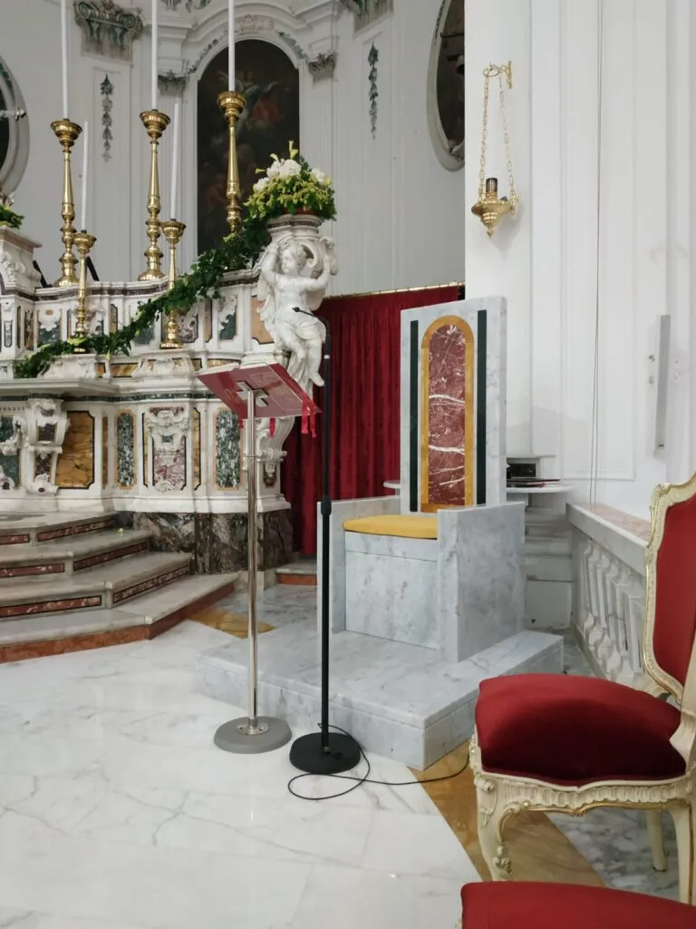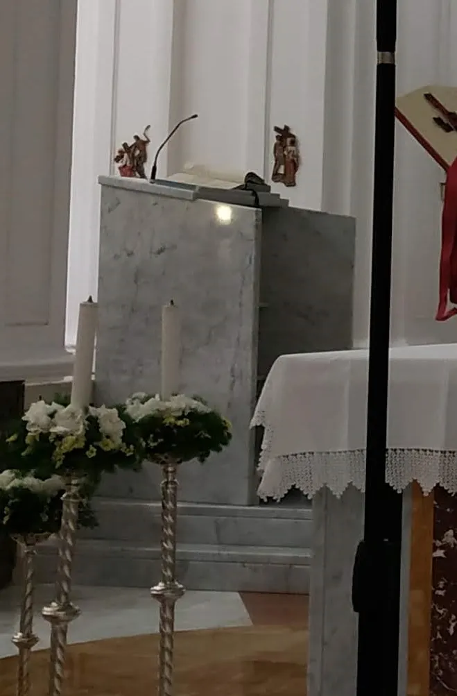 L’ambone deve essere possibilmente un arredo fisso, quindi non un semplice leggio e deve richiamare esteticamente l’altare. Va collocato in una posizione di cerniera tra l’altare e lo spazio dell’assemblea, ma in posizione decentrata.