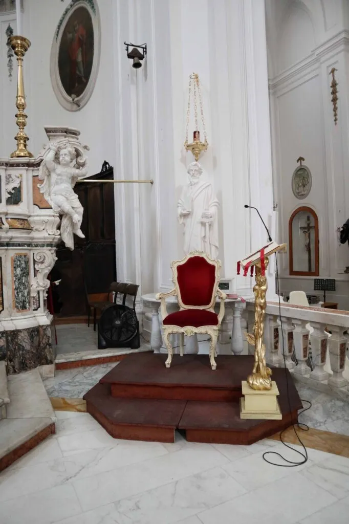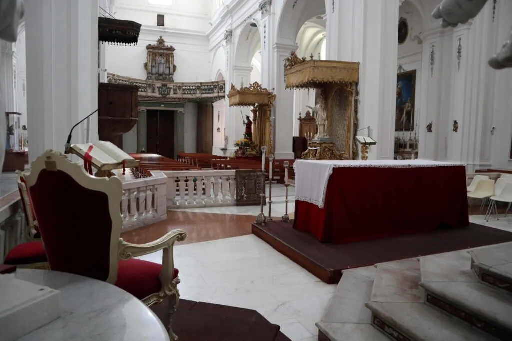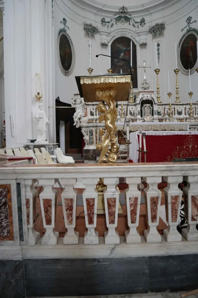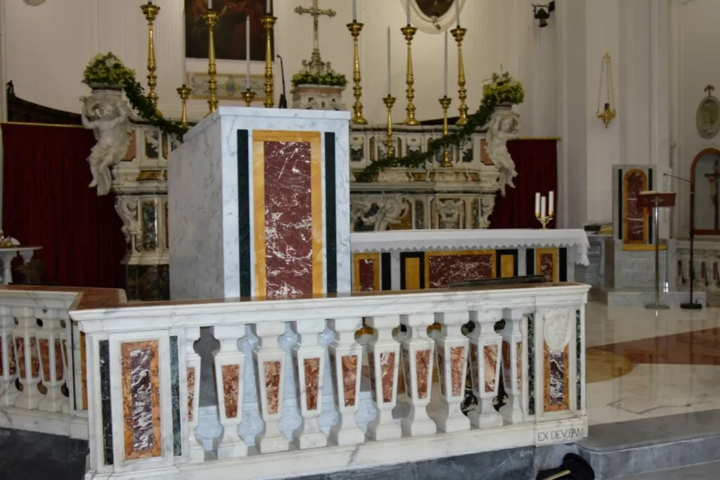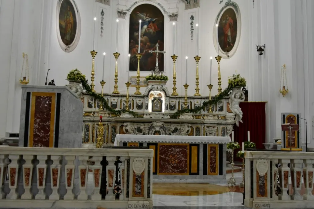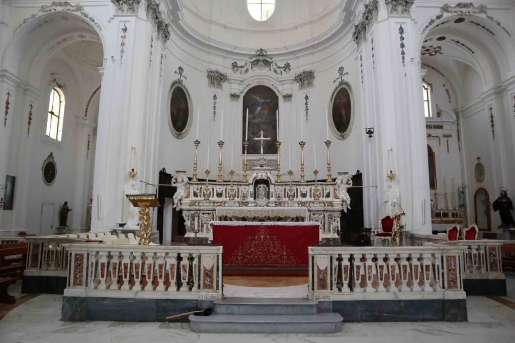 Il Marchese Ferdinando Cattaneo donò quattro grandi tele, quelle poi attribuite a Mattia Preti e i quadri degli Apostoli e degli Evangelisti. L’altare maggiore fu acquistato dalla chiesa dei Gesuiti di Sessa Aurunca grazie all’intermediazione del Marchese Cattaneo. La balaustra fu realizzata dai Conti Galante che apposero sull’opera lo stemma del casato. Le due acquasantiere della navata centrale furono acquistate a Napoli ed i sontuosi lampadari, furono regalati dal Marchese Cattaneo e dal Principe Filomarino della Rocca marito della Marchesina Rosa, unica figlia di Don Ferdinando. Il battistero fu ricavato dalla parte inferiore di un’antica fontana esistente nella ex chiesa dei Benedettini. Il 29 Maggio del 1823, giorno del “Corpus Domini”, l’Arciprete Don Vito Antonio Contuzzi e il clero, presenti il “popolo tutto” e le autorità capeggiate dal Sindaco Giuseppe Mianulli, presero possesso della nuova chiesa il cui patronato era del Comune. Fino al 1825 furono completati il pulpito, i “bussoloni” e le gradinate esterne. Dopo qualche anno nella nuova chiesa, che non aveva subito particolari danni dal terremoto del 1826, si manifestarono significative criticità, soprattutto in seguito ai gravi terremoti del 16 dicembre 1857, prima, e del 23 novembre 1980, poi.