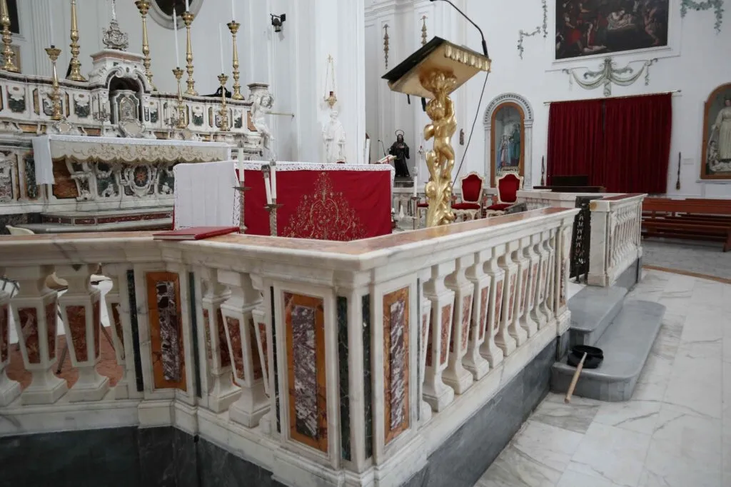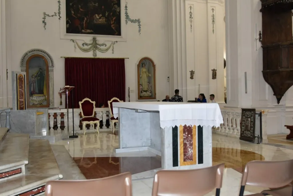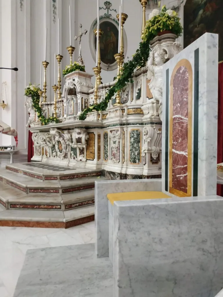 Architetto Sulla – Mi ero da poco laureata quando don Gabriele mi ha parlato dell’adeguamento liturgico della Chiesa Madre, e quindi del suo desiderio di dotarla di un altare, un ambone e una sede che fossero degni e a norma, e di cui la chiesa ne era sprovvista. Mi ha quindi proposto di sviluppare questo progetto, ed è stato un onore per me accettare e donare alla chiesa quella che sarebbe stata la mia prima opera. Mentre i nuovi arredi liturgici sono stati dono di un montese emigrato in Canada, Paolo Petrozza.