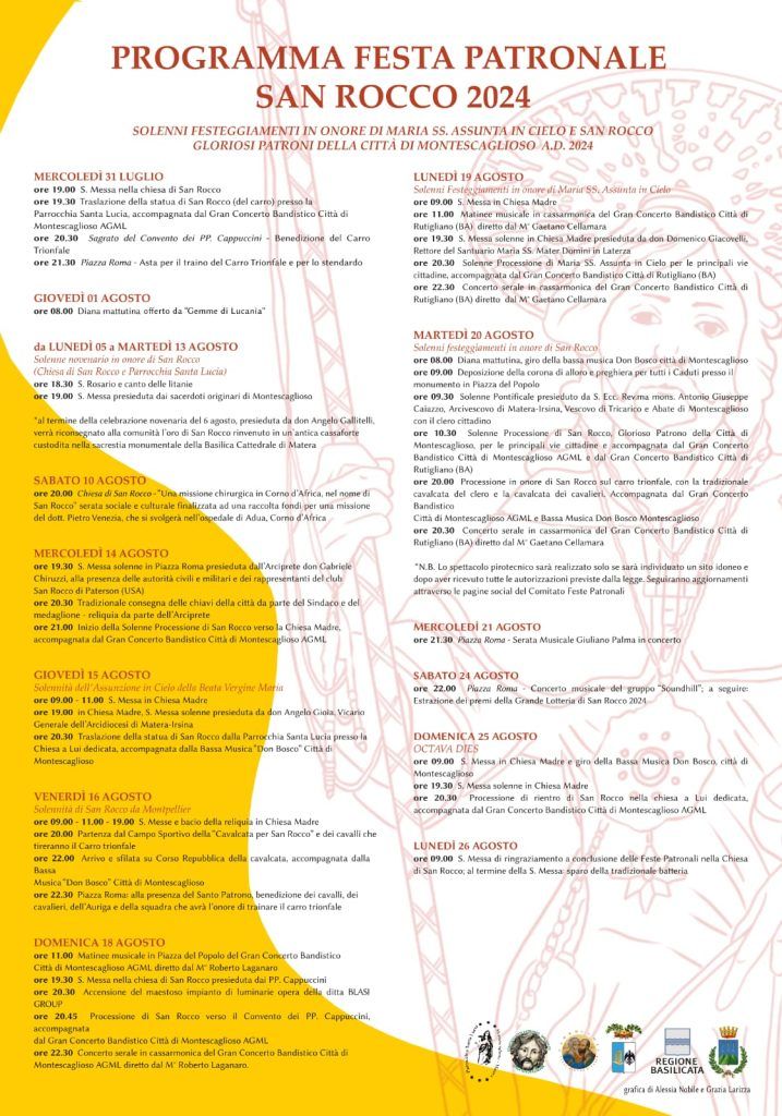 Sì, proprio oggi inizia questo cammino che accompagna sera per sera attraverso la riflessione dei sacerdoti montesi il popolo di Montescaglioso tutto – e tanti montesi migranti e fuorisede stanno ritornando a casa per l’occasione, e anche chi a questa comunità si sente legato – alle giornate del 15 e 16 agosto, solennità liturgiche dell’Assunta e di S. Rocco di Montpellier.
