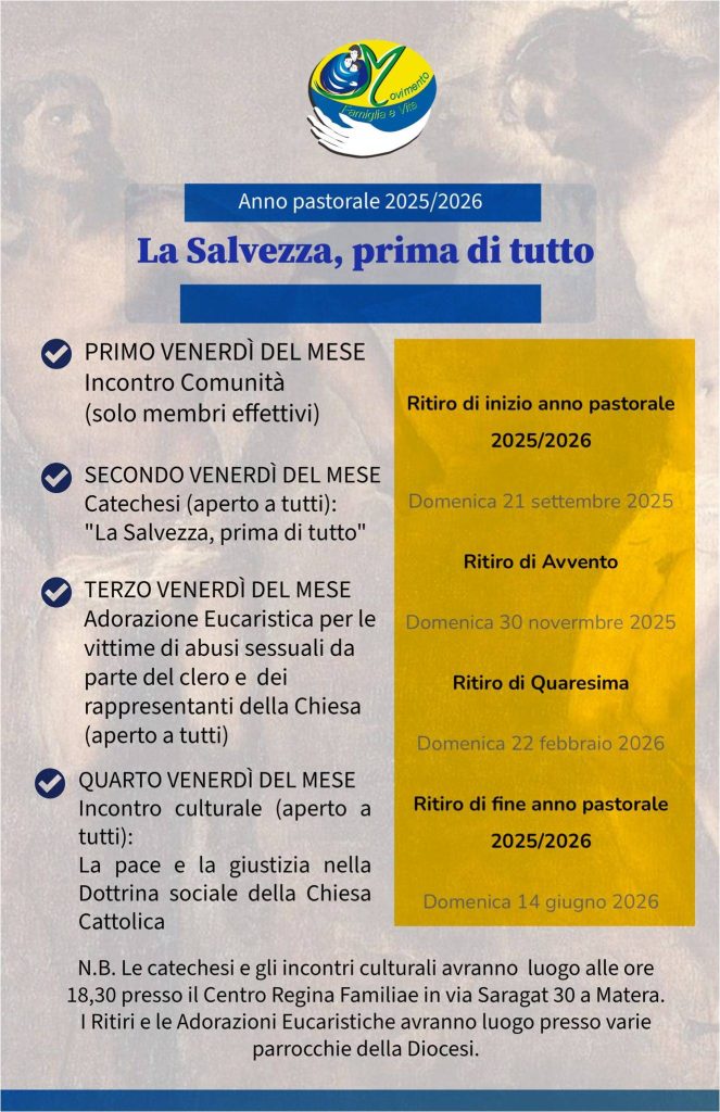 Infine, si precisa che le catechesi e gli incontri culturali si terranno alle 18,30 presso il Centro Regina Familiae in Via Saragat, 30 a Matera. I ritiri e le adorazioni eucaristiche si terranno presso varie parrocchie della Diocesi.