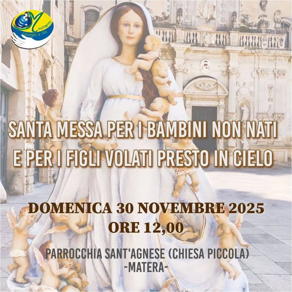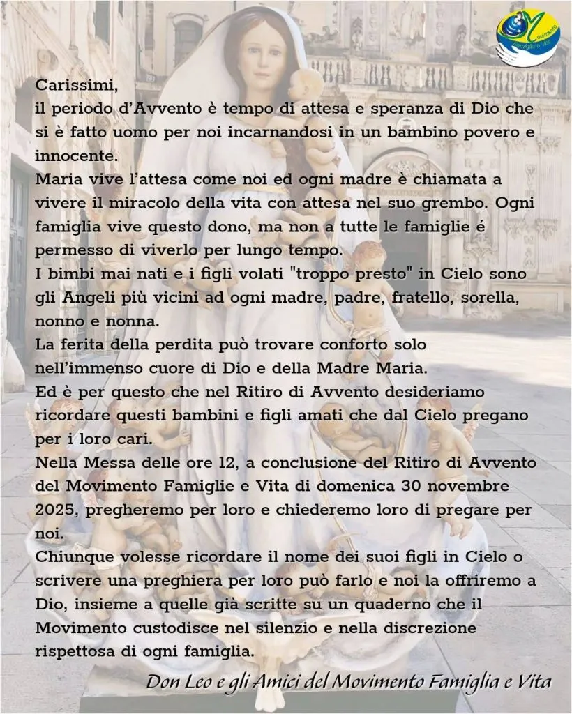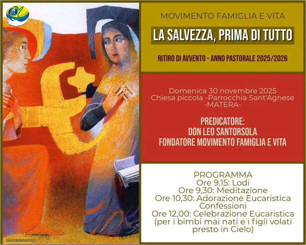 Organizzato dal Movimento Famiglia e Vita, domenica 30 novembre nella chiesa piccola della parrocchia Sant'Agnese a partire dalle ore 9,15 inizierà il Ritiro di Avvento anno pastorale 2025-2026. Alle ore 12,00 la Celebrazione Eucaristica a cura del Fondatore del Movimento don Leo Santorsola.