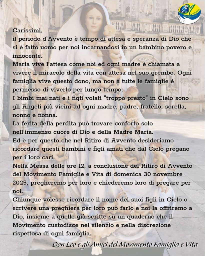Organizzato dal Movimento Famiglia e Vita, domenica 30 novembre nella chiesa piccola della parrocchia Sant'Agnese a partire dalle ore 9,15 inizierà il Ritiro di Avvento anno pastorale 2025-2026. Alle ore 12,00 la Celebrazione Eucaristica a cura del Fondatore del Movimento don Leo Santorsola.