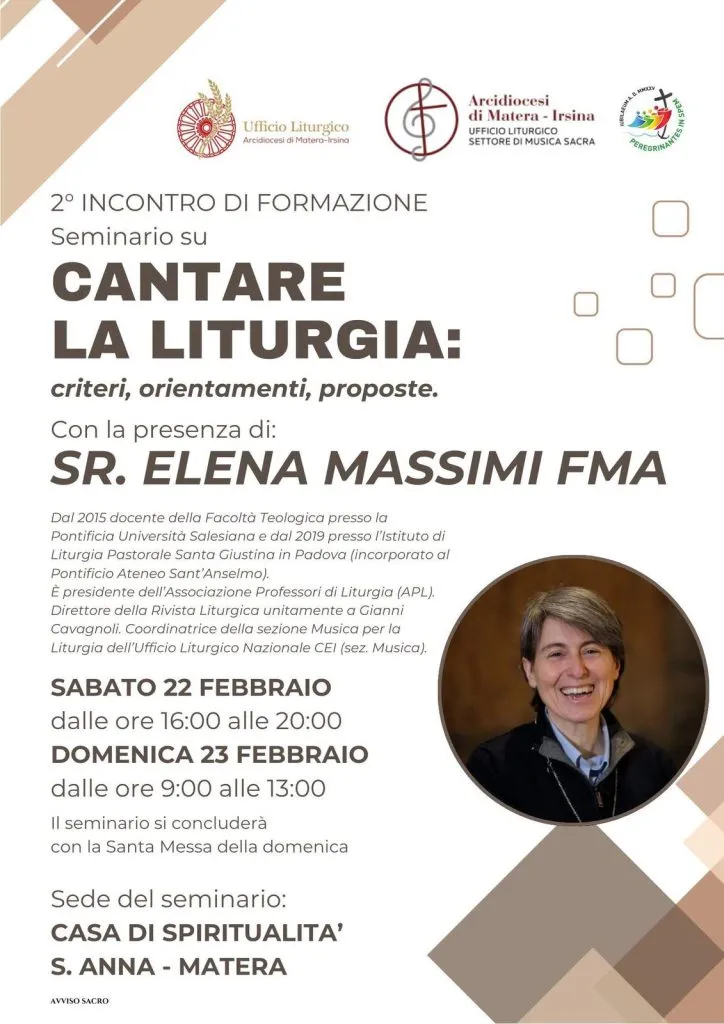 Ecco l’incontro del pomeriggio di sabato 22 febbraio e della domenica di domenica 23 febbraio nel salone di S. Anna guidato da sr. Elena Massimi fma, docente di liturgia presso la Facoltà Teologica Salesiana e presso l’istituto di liturgia pastorale “S. Giustina” in Padova e, inoltre, coordinatrice della Sezione Musica Sacra dell’Ufficio Liturgico Nazionale.