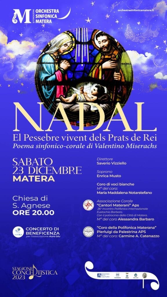 L’Orchestra Sinfonica di Matera eseguirà in concerto il poema sinfonico-corale NADAL, di Valentino Miserachs, il 23 dicembre alle ore 20,00 nella stupenda Chiesa di Sant’Agnese a Matera e sarà dedicato ai più deboli a chi la vita non ha sorriso.