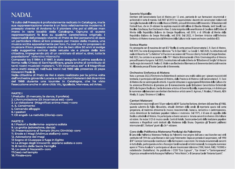 Parteciperanno alla realizzazione di NADAL la Corale dei Cantori Materani di Sandra Barbaro, la Polifonica materana Pierluigi da Palestrina di Carmine Catenazzo, il soprano Enrica Musto e il coro di voci bianche di Maria Maddalena Notarstefano. Il concerto sarà diretto dal direttore Saverio Vizziello.