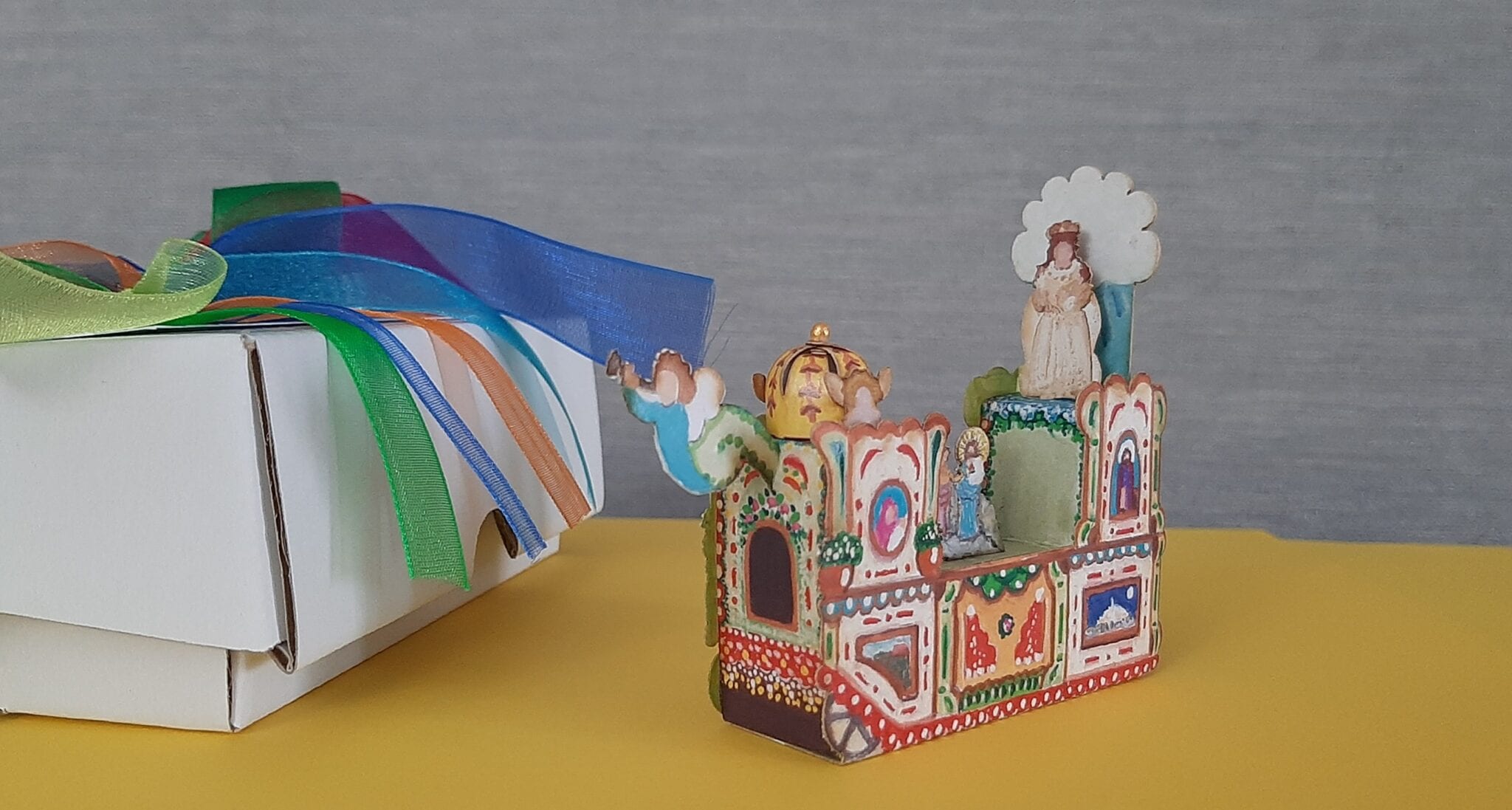 È una miniatura di una bellezza incredibile, racchiude in pochi centimetri l’essenza e il simbolo di una festa millenaria: dietro la riproduzione del carro della Bruna firmata da Grazia Balice c’è un lavoro minuzioso nel quale la creatività dell’artista va di pari passo con la tecnologia. Sì, perché, prima di dipingere e assemblare i piccoli pezzi, è necessario tagliare il cartoncino con il laser seguendo il prototipo realizzato in precedenza.