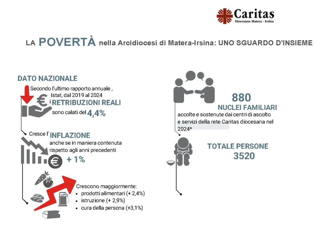La diocesi di Matera-Irsina conta 138.222 abitanti, ma solo 880 nuclei (3.520 persone) si sono rivolti ai centri di ascolto nel 2024. Questo dato, seppur quantitativamente modesto, rivela una povertà “latente”, spesso invisibile e non intercettata dai servizi. Si conferma una prevalenza di donne tra coloro che domandano aiuto, dato già rilevato localmente nel 2021.