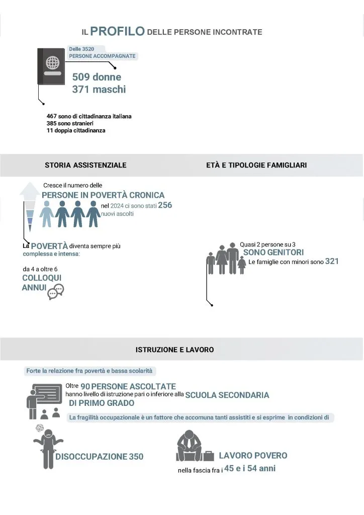 Va inoltre segnalata la presenza crescente della “povertà di ritorno“: “Ci sono persone che erano uscite da una situazione difficile grazie a un’opportunità, ma che, venuta meno quella risorsa, sono ricadute nella fragilità. Questo dimostra che servono politiche e strumenti strutturali, non risposte una tantum“.