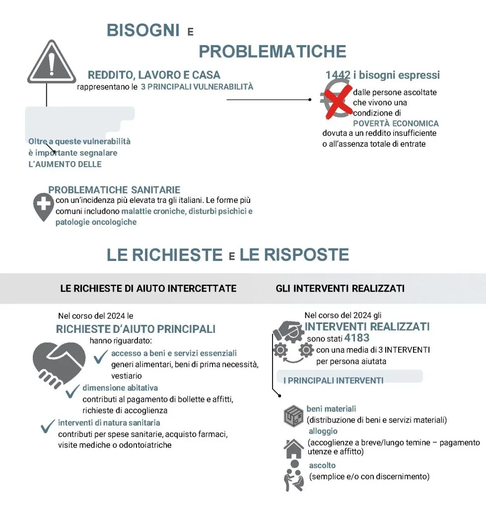 Una delle tendenze più allarmanti è la crescente cronicizzazione della povertà: nel 2023 le persone manifestavano da uno a tre bisogni, mentre nel 2024 si arriva fino a cinque. Gli interventi erogati sono stati 4.183, con alcuni nuclei che ne hanno ricevuti fino a sette.