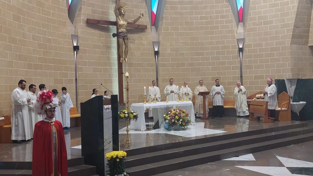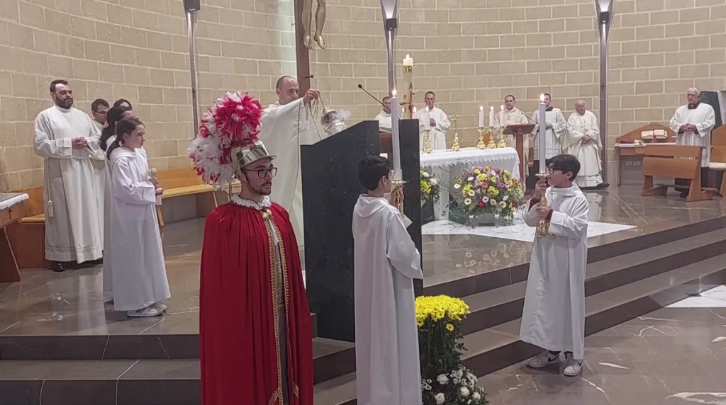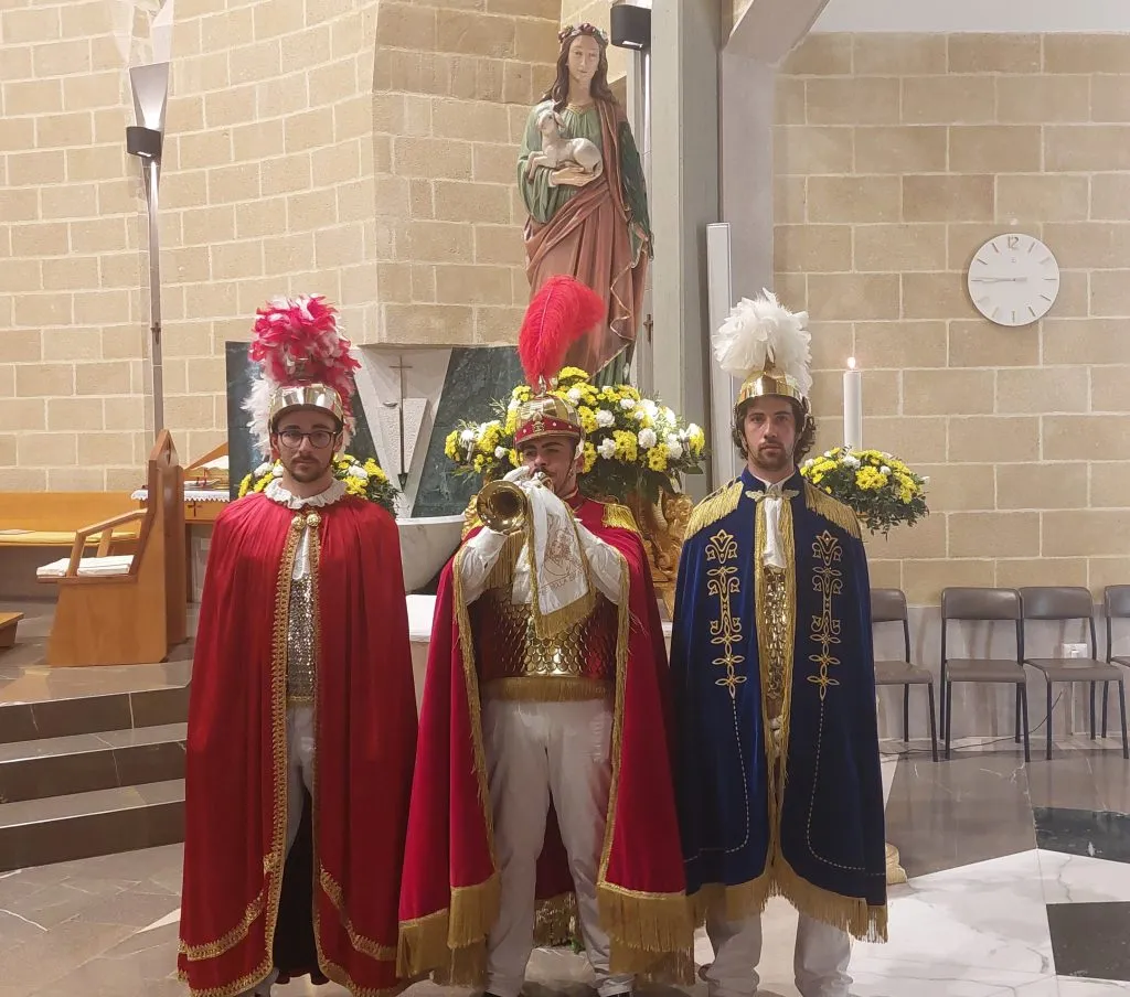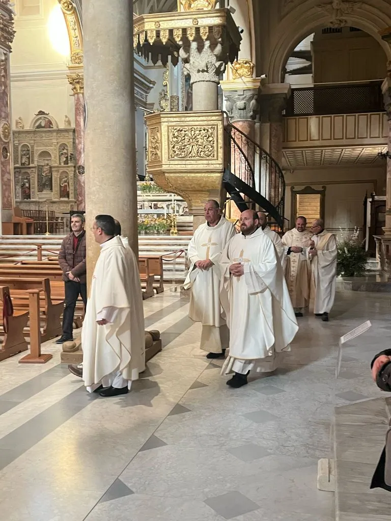 Gli squilli delle trombe suonate dai Cavelieri della Bruna in uniforme, i fiori sul presbiterio, l’inno del Giubileo “Pellegrini di speranza” suonato festosamente accompagnato dalla tromba, l’assemblea compostamente disposta in attesa della celebrazione, abbondante di Cavalieri e Pastori della Bruna, nonché del Comitato e dell’Associazione “Maria Ss. della Bruna” – del cui Consiglio di Amministrazione don Francesco è delegato arcivescovile –, le luci… tutto dice il clima di festa solenne che stiamo per vivere! Don Nino Martino, parroco di S. Agnese, don Donato Di Cuia e don David Mannarella, altri sacerdoti che, come don Francesco, sono “usciti” dalla parrocchia di S. Agnese, p. Basilio Gavazzeni, parroco storico di S. Agnese, concelebrano con don Francesco questa Eucaristia importante, mentre mons. Biagio Colaianni vi assiste e tiene l’omelia. Non mancano i ministranti, piccoli e grandi: tra loro Sergio Di Pede, in cammino verso il diaconato permanente, che legge la monizione che prepara l’assemblea alla celebrazione: