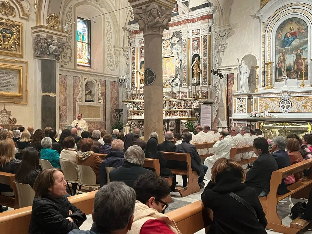 Un presbiterio gremito di sacerdoti – don Biagio Plasmati, don Angelo Tataranni, don Bruno Buonamassa, don Gianpaolo Grieco –, diaconi – Giuseppe Avena, Giuseppe Fiorentino, Giuseppe Centonze, Pietro Oliva – e ministranti, grandi e piccoli, con a capo l’accolito Edo Veronesi.