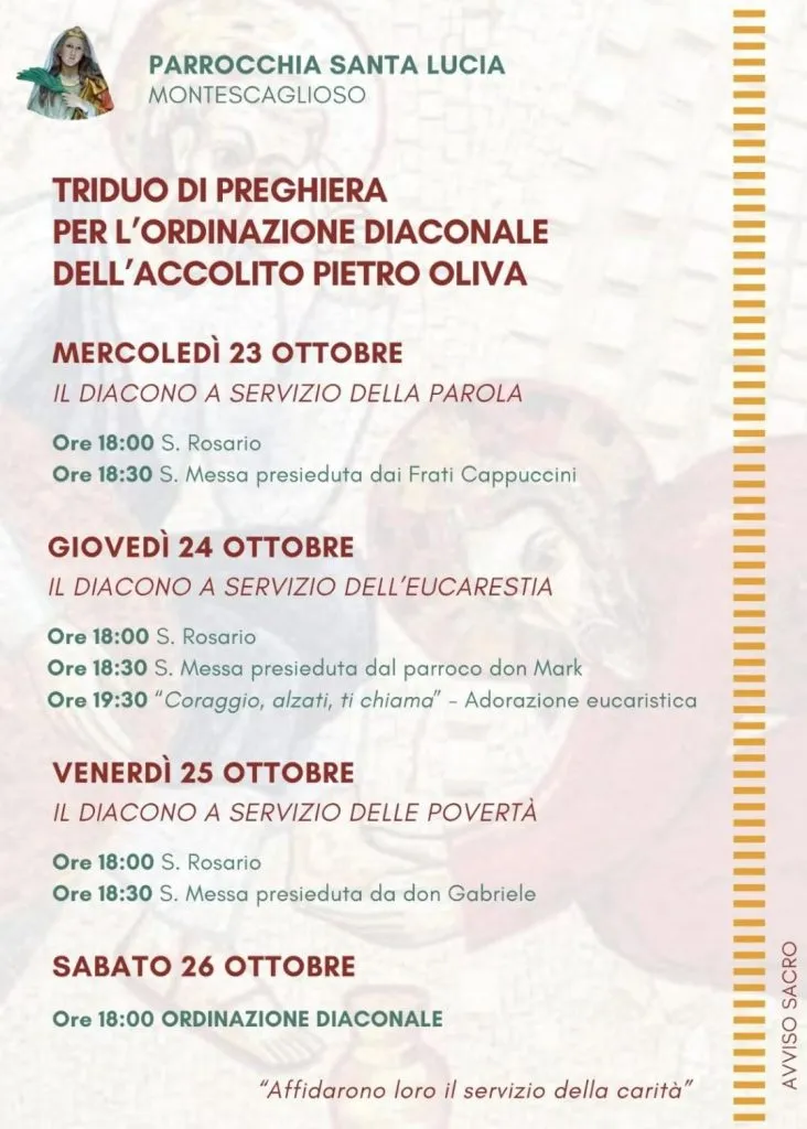La cerimonia di ordinazione è stata preceduta da un Triduo di preghiera nei giorni 23, 24 e 25 ottobre, sempre presso la Parrocchia di Santa Lucia, avente i seguenti temi di riflessione: “Il diacono a servizio della Parola”, “Il diacono a servizio dell’Eucarestia” e “Il diacono a servizio della povertà”.