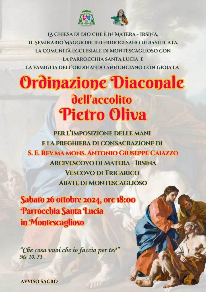 Il primo ottobre scorso, nel Salone degli Stemmi presso l’Episcopio, davanti a mons. Antonio Giuseppe Caiazzo, arcivescovo di Matera-Irsina e vescovo di Tricarico, si era tenuto il giuramento del seminarista Pietro Oliva, in vista della sua ordinazione diaconale.