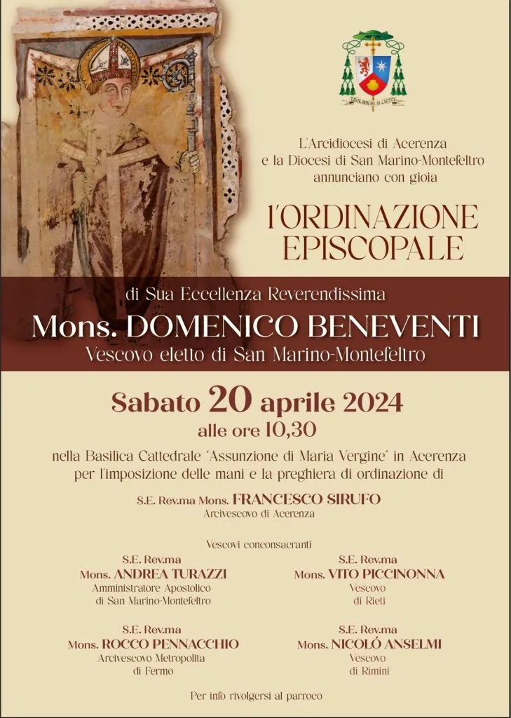 La comunità diocesana di Acerenza, sabato 20 aprile 2024 alle ore 10:30 nella Cattedrale ‘Assunzione di Maria Vergine’, assisterà all’ordinazione episcopale del suo figlio Mons. Domenico Beneventi a Vescovo della Diocesi di San Marino-Montefeltro. La celebrazione sarà presieduta dall’arcivescovo di Acerenza Mons. Francesco Sirufo e sarà trasmessa in diretta Tv su TRM NETWORK (canale 16 Puglia e Basilicata, Sky canale 519, Tivùsat 519, Web streaming www.trmtv.it ) e su San Marino RTV.