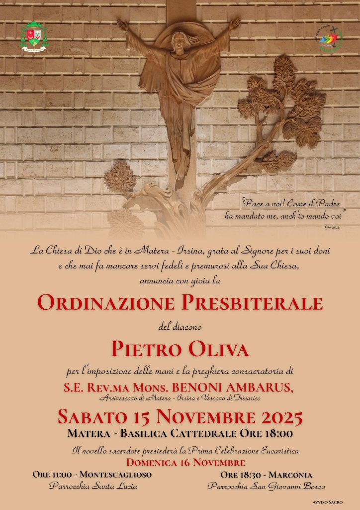 Sabato 15 novembre alle ore 18, nei primi vespri della 33^ domenica del tempo ordinario, giornata mondiale dei poveri, per la preghiera consacratoria e l’imposizione delle mani di mons. Benoni Ambarus, arcivescovo di Matera-Irsina, don Pietro viene ordinato presbitero nella Cattedrale di Matera.