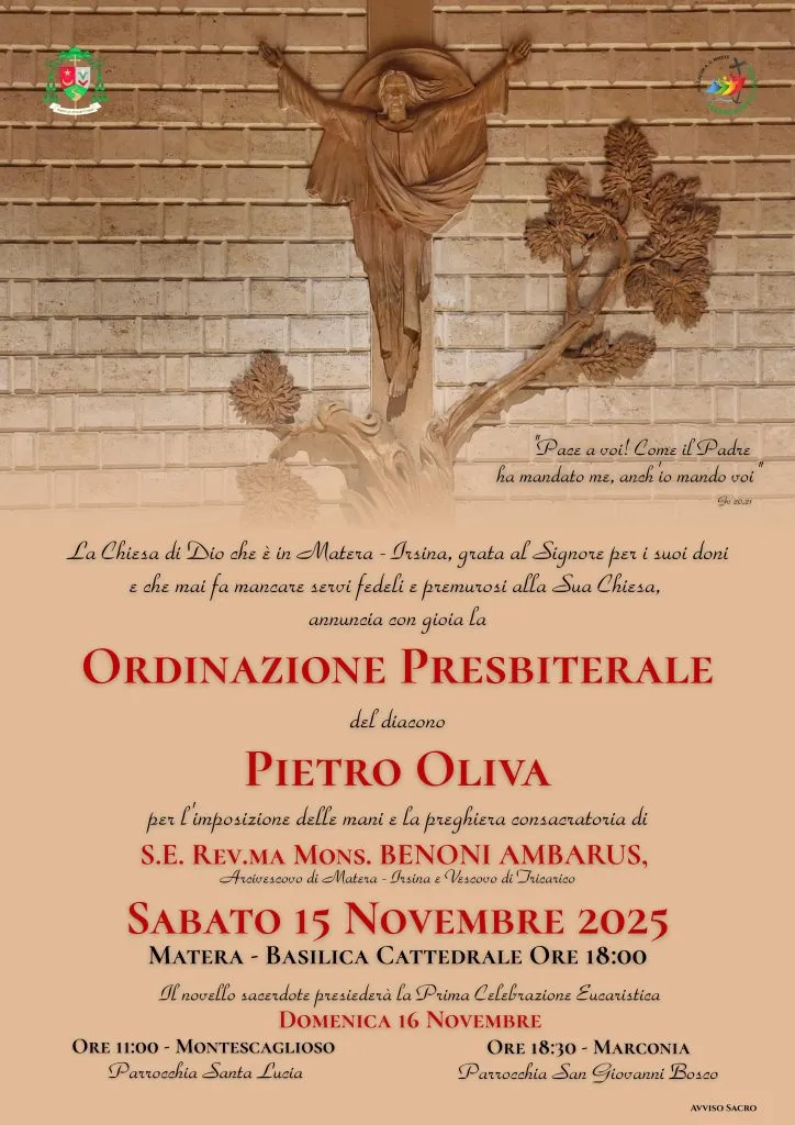 Sabato 15 novembre alle ore 18, nei primi vespri della 33^ domenica del tempo ordinario, giornata mondiale dei poveri, per la preghiera consacratoria e l’imposizione delle mani di mons. Benoni Ambarus, arcivescovo di Matera-Irsina, don Pietro viene ordinato presbitero nella Cattedrale di Matera.