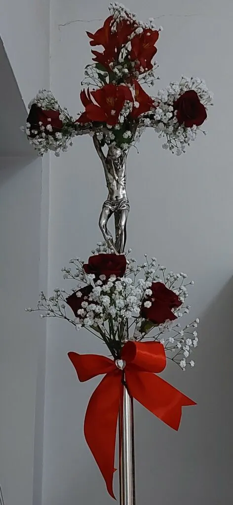 Segno eloquente nella liturgia di oggi, oltre le palme e il colore rosso “martirio” dei paramenti liturgici del celebrante, è la croce “fiorita” che un ministrante porta in processione. Croce fiorita, adornata di fiori in segno di rispetto e di rappresentazione che dall’offerta di Gesù nasce la vita! L’albero di morte diviene albero di vita, quello che era al centro dell’Eden!