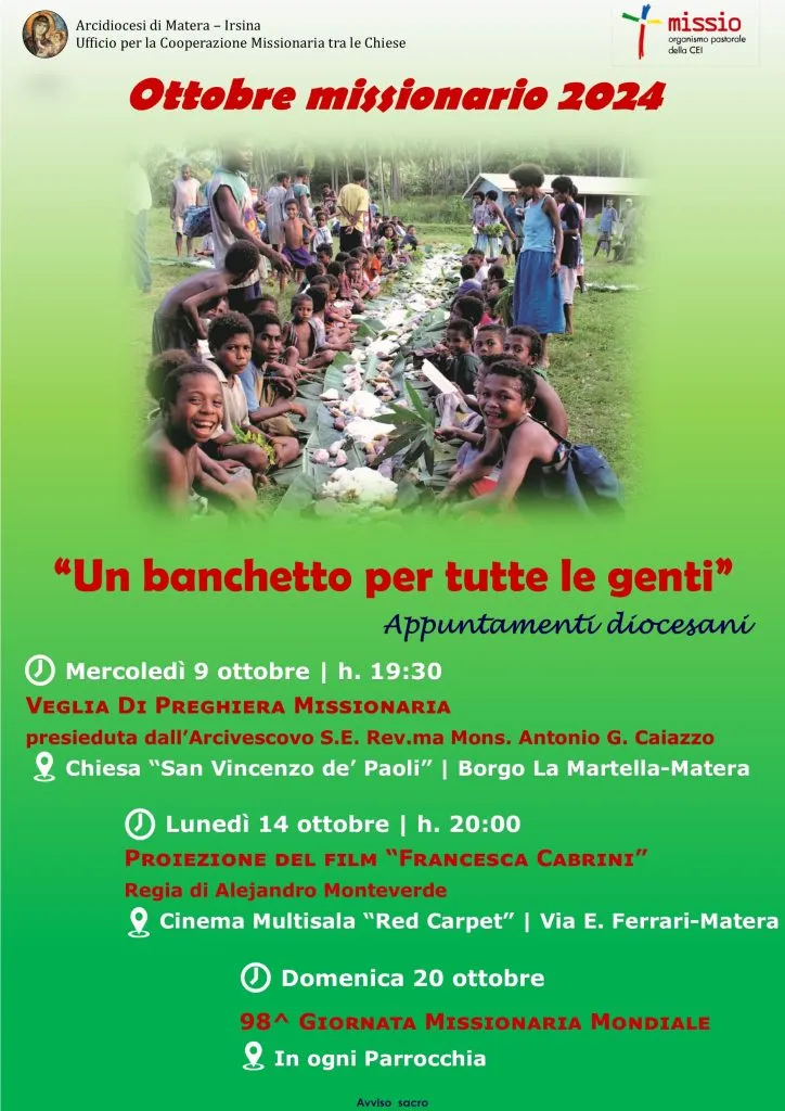 - Mercoledì 9 ottobre, ore 19:30, presso la chiesa di “S. Vincenzo de’ Paoli” (Borgo La Martella – Matera), la veglia missionaria che presiede il nostro padre Arcivescovo. Durante la veglia darà la sua testimonianza padre Bonaventura, frate cappuccino, missionario in Albania.