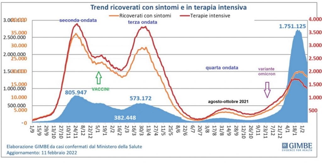 L’aumento dei contagi tra i vaccinati con due e financo tre dosi non poteva non far sorgere la domanda circa la reale efficacia dei vaccini. Mentre per la gran parte delle vaccinazioni obbligatorie disponiamo di dati certi circa la prevenzione del contagio per gli attuali vaccini anti Covid abbiamo preso atto della loro capacità di evitare la malattia, specie quella in forma grave, ma non il contagio. Può essere questo un motivo per ritenere la vaccinazione del tutto inutile? Sicuramente no e lo dimostra l’infografica di copertina che documenta come il numero di ricoveri in ospedale (in terapia intensiva e non) abbia subito un brusco calo a pochi mesi dall’inizio della campagna vaccinale e pur in presenza di un rilevante aumento di casi di infezione.