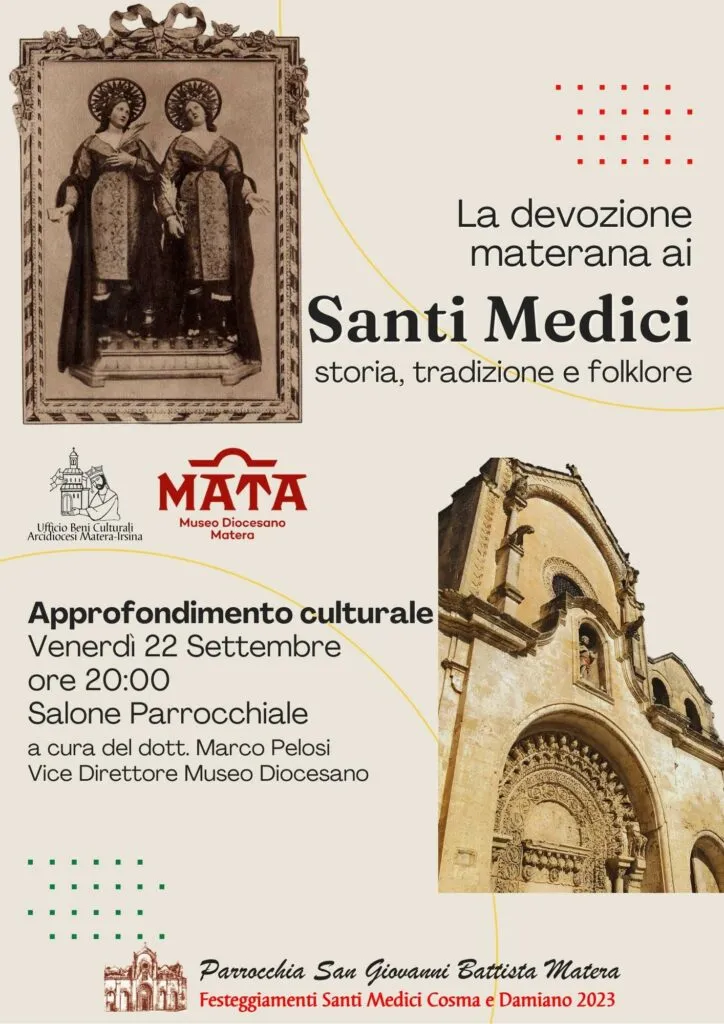 Nell’ambito dei Festeggiamenti in onore di Santi Medici Cosma e Damiano, la Parrocchia San Giovanni Battista ha organizzato un approfondimento culturale dal titolo “La devozione materana ai Santi Medici: storia, tradizione e folklore”. L’evento si svolgerà venerdì 22 settembre alle ore 20:00 nel Salone Parrocchiale della Chiesa Di San Giovanni Battista e sarà tenuto dal dott. Marco Pelosi, Vice Direttore del Museo Diocesano.