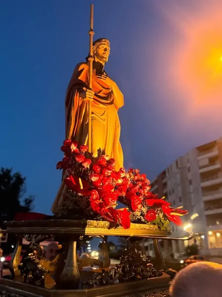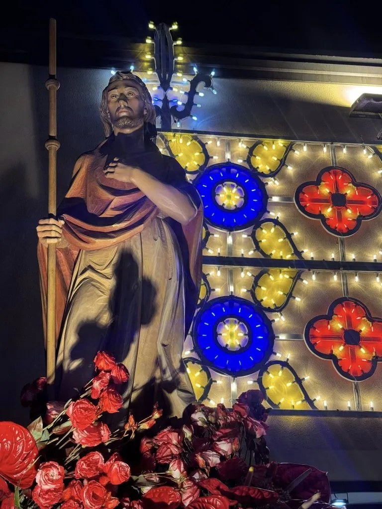 C’è l’aria carica dell’attesa della vigilia in chiesa nell’ultima sera della novena: il rosso dei paramenti, che fa da pendant con il rosso dei fiori del presbiterio, ci dice che liturgicamente siamo già entrati nella festa di San Giacomo. È alle coppie di sposi e fidanzati che quest’ultima serata del triduo è dedicata.