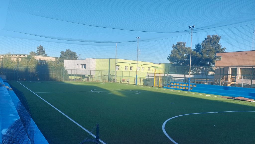 Con questo intervento, l’originale campo da basket divenne un campo multifunzionale, con la predisposizione per la posa della rete di pallavolo e le segnature per i diversi sport.
