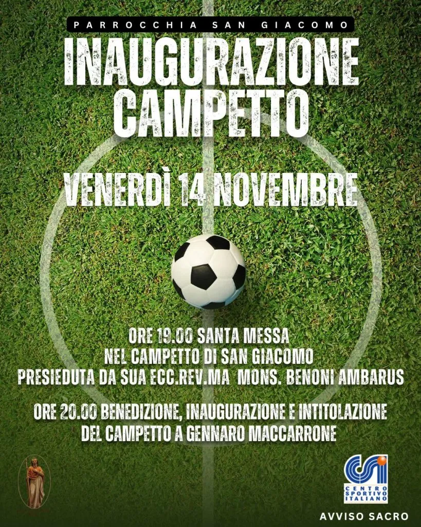 Se il salone della parrocchia riporta la targa di don Franco, storico parroco quarantennale della comunità di San Giacomo, il campo sarà intitolato al geom. Gennaro Maccarrone, fedelissimo parrocchiano di San Giacomo, oltreché presidente del CSI, che con la sua impresa edile, nel 1992, contribuì all’ampliamento e alla ripavimentazione del vecchio campetto, nato già precedentemente alla costruzione della chiesa.