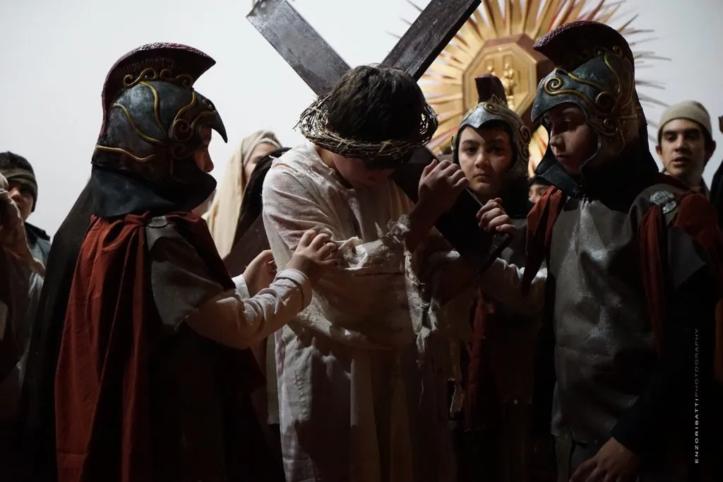 Prendendo spunto da una Via Crucis per bambini, una catechista della parrocchia “S. Giacomo”, Rossella Maccarrone, ha elaborato brevi meditazioni, integrate in alcune stazioni da piccole battute affidate ai fanciulli e ha organizzato una efficace regia, fatta di poche parole e molte immagini espressive e servendosi di una cinquantina di attori dai due ai 17 anni.