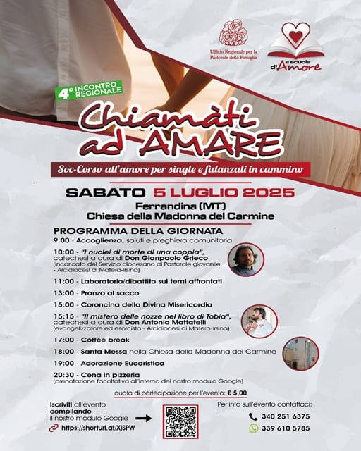 Dopo il successo delle precedenti tappe che si sono tenute nelle parrocchie “Madonna di Pompei” (Garaguso Scalo), “S. Pietro Caveoso”, “S. Vincenzo de’ Paoli”, domani 5 luglio il quarto appuntamento di “Chiamati ad amare” si svolge a Ferrandina, nella Parrocchia “Madonna del Carmine” (detta anche del “Purgatorio”), dalle ore 9 sino a sera con una pizzata.