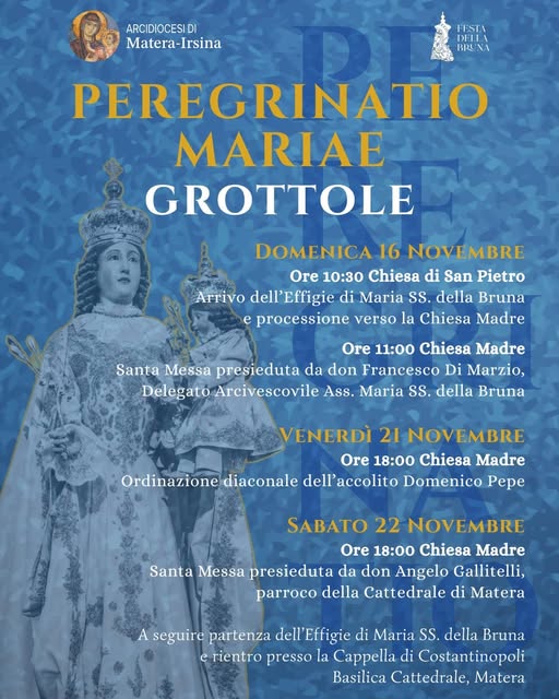 Il 21 novembre nella Chiesa Madre alle ore 18,00 ci sarà la bella novità dell’ordinazione diaconale dell’accolito Domenico Pepe con l’imposizione delle mani e la preghiera consacratoria di mons. Benoni Ambarus, arcivescovo di Matera-Irsina e vescovo di Tricarico.