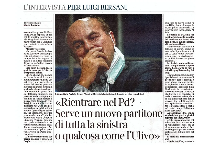 Nei giorni scorsi, in un’intervista al Corriere della Sera, Pierluigi Bersani ha tirato fuori una delle sue idee, una delle sue “ideone” è il caso di dire: quella del “partitone”. È un’idea che viene fuori evidentemente dai problemi che i partiti, i “partitini”, stanno incontrando nell’individuare il candidato ideale per il Quirinale. Nella speranza che lo spettro di Berlusconi non allunghi, nel frattempo, la sua ombra sulle tante anime in pena che vagano tra i grandi elettori e che potrebbero abboccare all’amo berlusconiano. O che qualche allegro sciamàno italiano occupi il Quirinale per impedire che Mattarella vada via; dopo tutto quello che abbiamo visto con i no-vax, chi potrebbe escluderlo?
