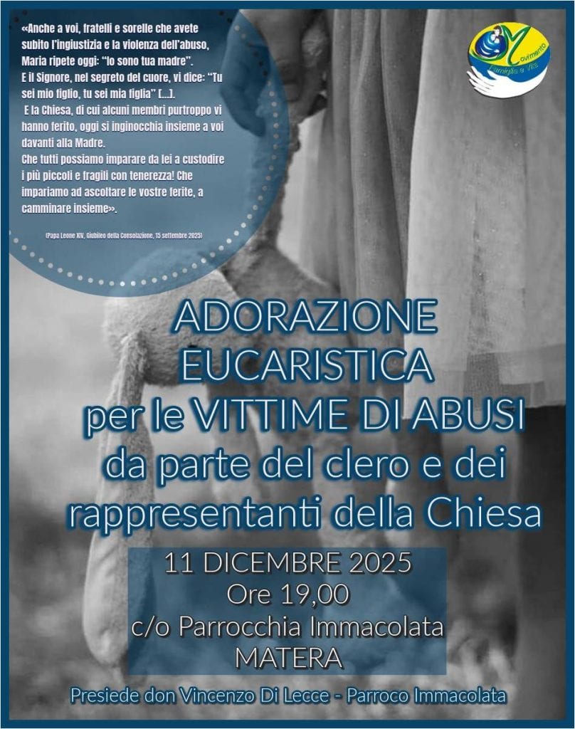 Preghiera per le vittime e sopravvissuti degli abusi. Adorazione Eucaristica del Movimento Famiglia e Vita che si terrà giovedì 11 dicembre alle ore 19,00 presso la Parrocchia Immacolata di Matera.