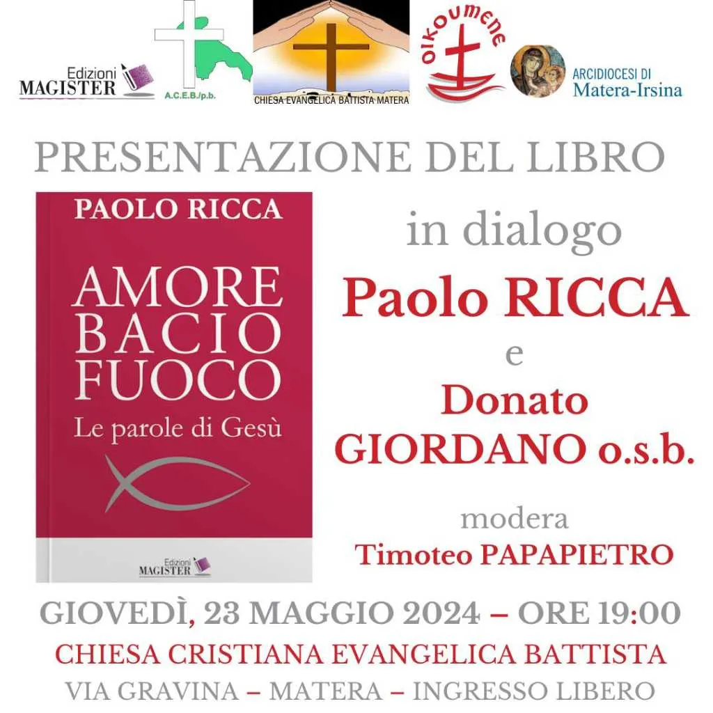 Giovedì 23 maggio, alle ore 19, sarà presentato, presso la Chiesa Cristiana Evangelica Battista di Via Gravina, il libro di Paolo Ricca ”Amore Bacio Fuoco- le parole di Gesù”, pubblicato per le edizione Magister. Dialogheranno con l'autore l'editore Timoteo Papapietro e Dom. Donato Giordano Osb, docente di Teologia Pastorale ecumenica presso la Facoltà Teologica Pugliese, nonchè Priore e Rettore del Monastero Santuario S. Maria di Picciano.
