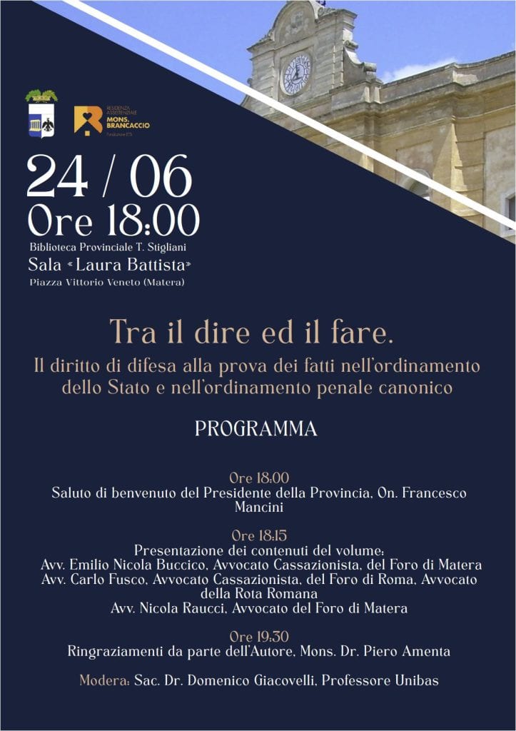 Porterà i saluti istituzionali il presidente della Provincia di Matera Francesco Mancini, modererà i lavori don Domenico Giacovelli, professore Unibas. A fine serata, l’autore mons. Pietro Amenta porgerà i suoi ringraziamenti.