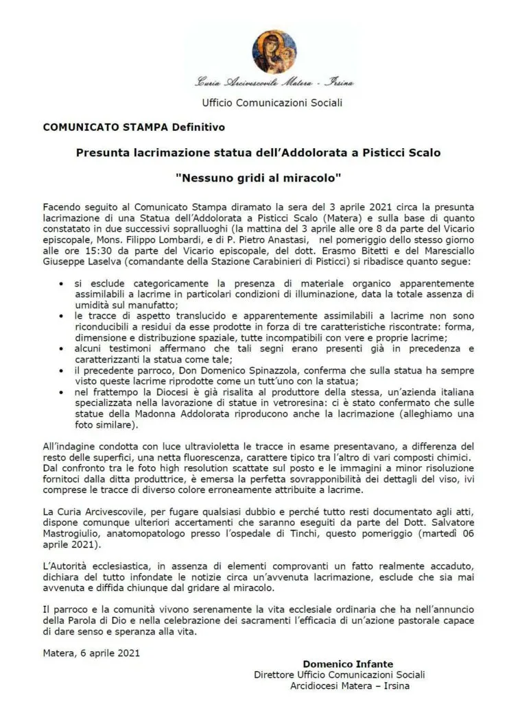 Comunicato stampa dell’Arcidiocesi di Matera-Irsina