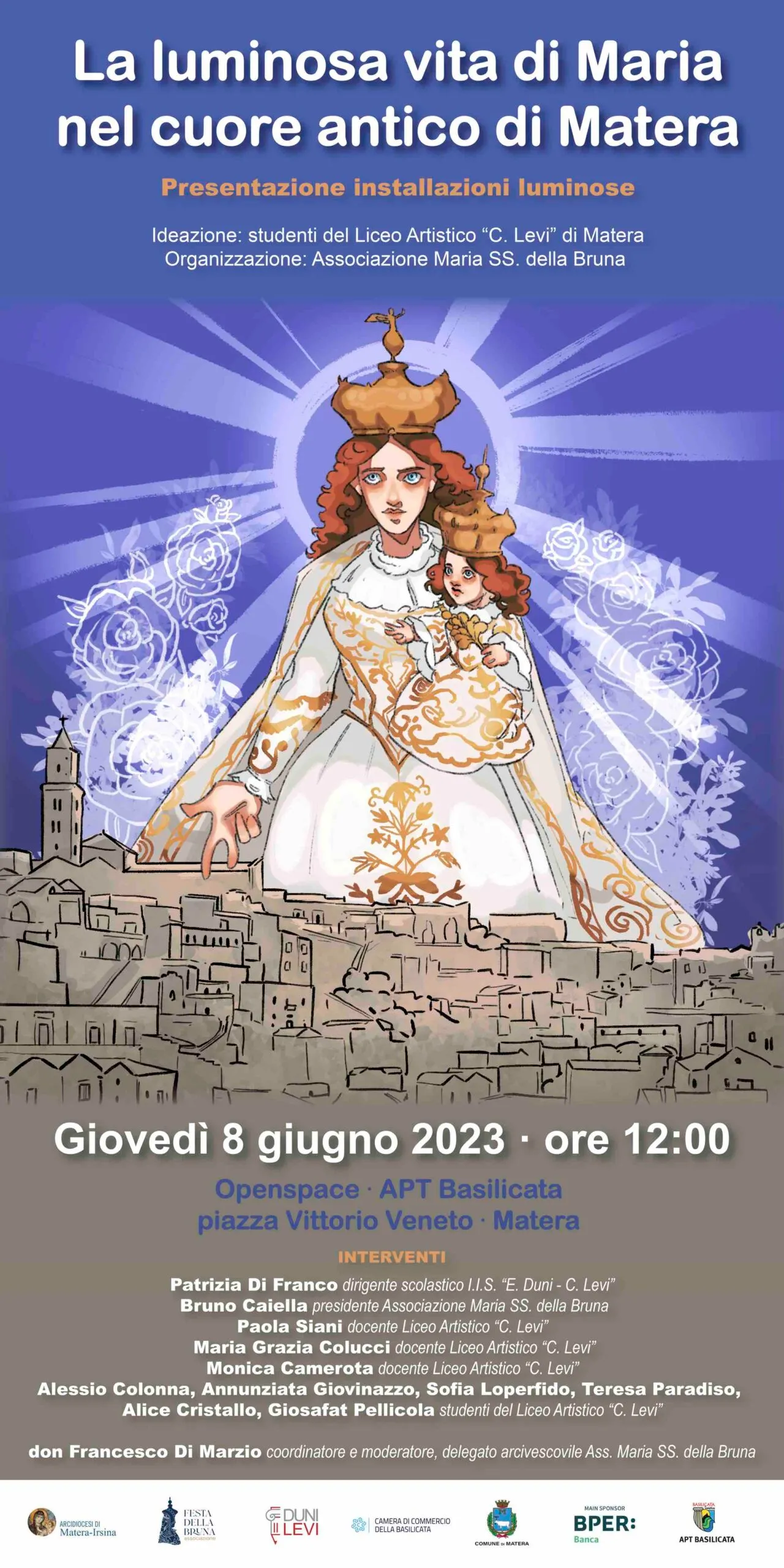 Il Progetto “LA LUMINOSA VITA DI MARIA NEL CUORE ANTICO DI MATERA” è nato dalla collaborazione del Liceo Artistico Duni-Levi con l’Associazione Maria Santissima della Bruna ed è stato sviluppato su otto temi Evangelici.