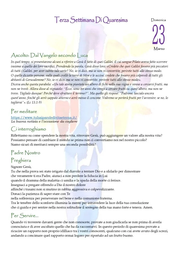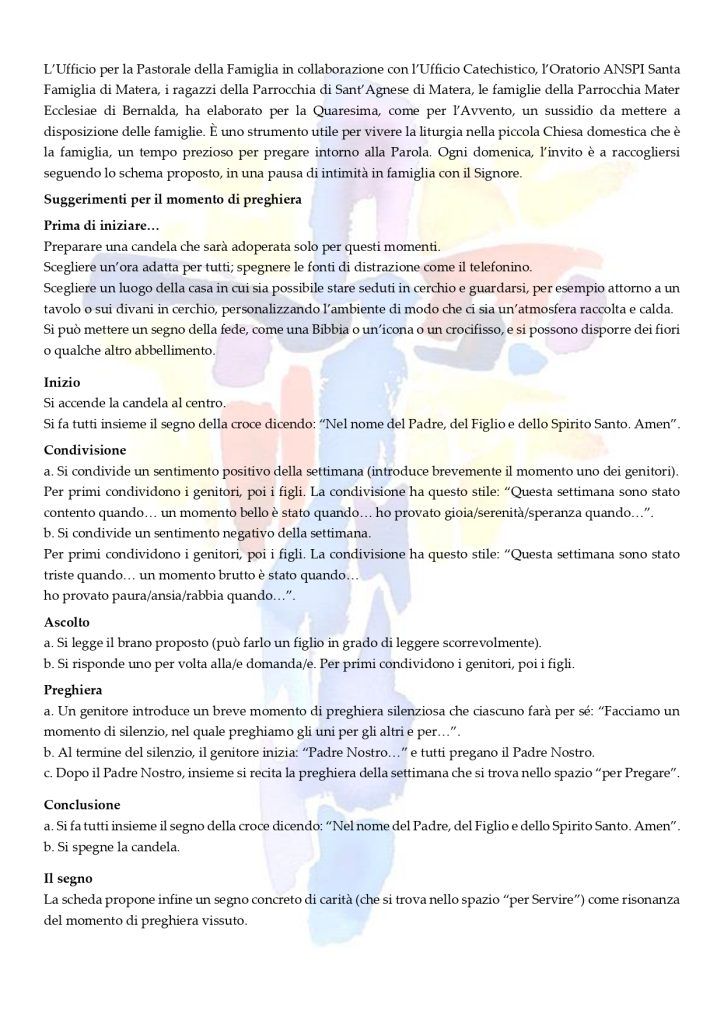 Uno strumento utile per vivere la liturgia nella piccola Chiesa domestica che è la famiglia, un tempo prezioso per pregare intorno alla Parola, per meditarla, per interrogarci, per avere spunti per impegnarci nel servizio. Chi vuole ampliare la meditazione, anche a partire dagli altri testi della Parola del giorno, nel sussidio trova un link al blog di don Pasquale Giordano (sezione “Per meditare”).
