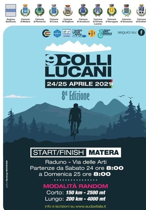 Anche nella 8^ edizione la scalata del Monte Croccia è il punto più impegnativo del percorso. Il Monte Croccia è una salita vera, molto impegnativa, che si affronta dopo 120 km per arrivare ai 1086 mt di quota. La salita che si affronta è lunga 14 km con una pendenza media del 7% e punte con pendenze fino al 18%, più dura di Pordoi o Gardena. Il dislivello totale del percorso è da brividi: 4.200 metri, diluiti su un itinerario di 200 chilometri, estremamente suggestivo, che parte da Matera in via delle Arti nella zona Paip 1, per poi passare dai comuni di Tricarico, Campomaggiore, Pietrapertosa, Accettura, Oliveto Lucano, Garaguso, Grassano, Grottole e finire di nuovo al punto di partenza di Matera.La Nove Colli Lucani si potrà svolgere regolarmente anche in periodo COVID in quanto inserita nell’elenco degli eventi sportivi riconosciuti dal CONI come eventi di rilevanza nazionale.E’ una manifestazione sportiva, non competitiva, di resistenza e regolarità su un percorso obbligato, da portarsi a termine in totale e assoluta autonomia entro il termine massimo di 13h dalla partenza. Per evitare ogni assembramento tra i ciclisti partecipanti la Randonnèe si svolgerà nella modalità Random che prevede una partenza libera a partire dalle ore 08:00 del sabato 24 Aprile fino alle ore 8 della domenica 25 Aprile. Lungo il percorso sono previsti dei punti di controllo dove il ciclista partecipante potrà registrare il suo passaggio. A fine percorso l’organizzazione rilascerà ai ciclisti Finisher un brevetto riconosciuto da Ari Audax Italia, che permetterà di entrare nella nazionale randonnee Italia e di partecipare alla Parigi-Brest che si svolge ogni quattro anni a Parigi. Inoltre la Nove Colli Lucani è inserita all’interno del circuito randonnèe Rando tour Magna Grecia, che comprende tutte le randonnèe che si svolgono in Campania, Puglia, Basilicata, Calabria e Sicilia.