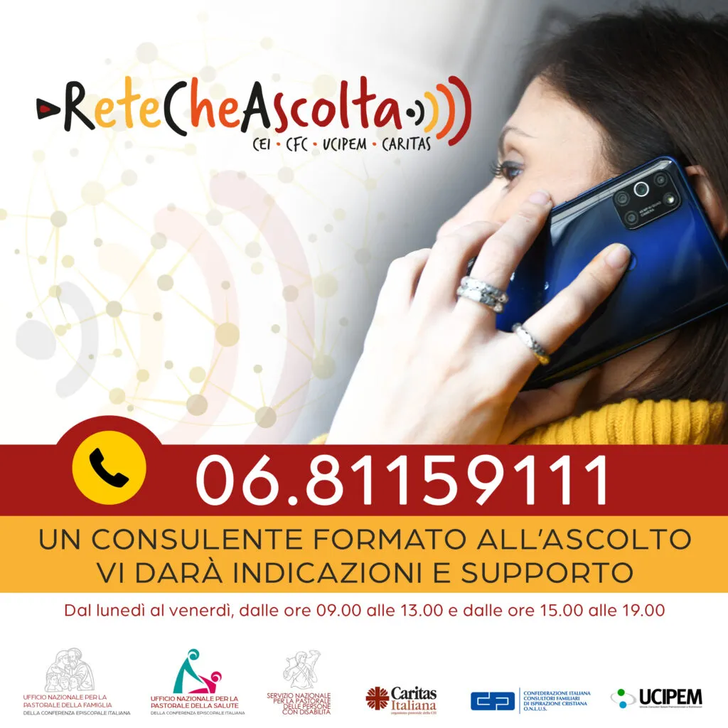 “Rete che ascolta” è il progetto della Chiesa italiana che collega 63 Consultori familiari e mette a disposizione le competenze di 309 operatori attraverso il numero 06.81159111 e, per le persone con disabilità, attraverso la mail pastoraledisabili@chiesacattolica.it.