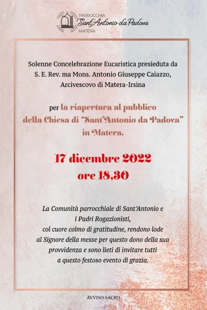 Dopo quasi un anno e mezzo dall’11 luglio 2021, data in cui si verificò il crollo di alcuni pezzi di cornicioni della chiesa e disposta la relativa chiusura al culto, finalmente sono stati ultimati i lavori di ripristino delle parti lesionate e di messa in sicurezza di tutta la struttura, per cui con grande gioia si annuncia la riapertura della chiesa di Sant’Antonio da Padova a Matera.
