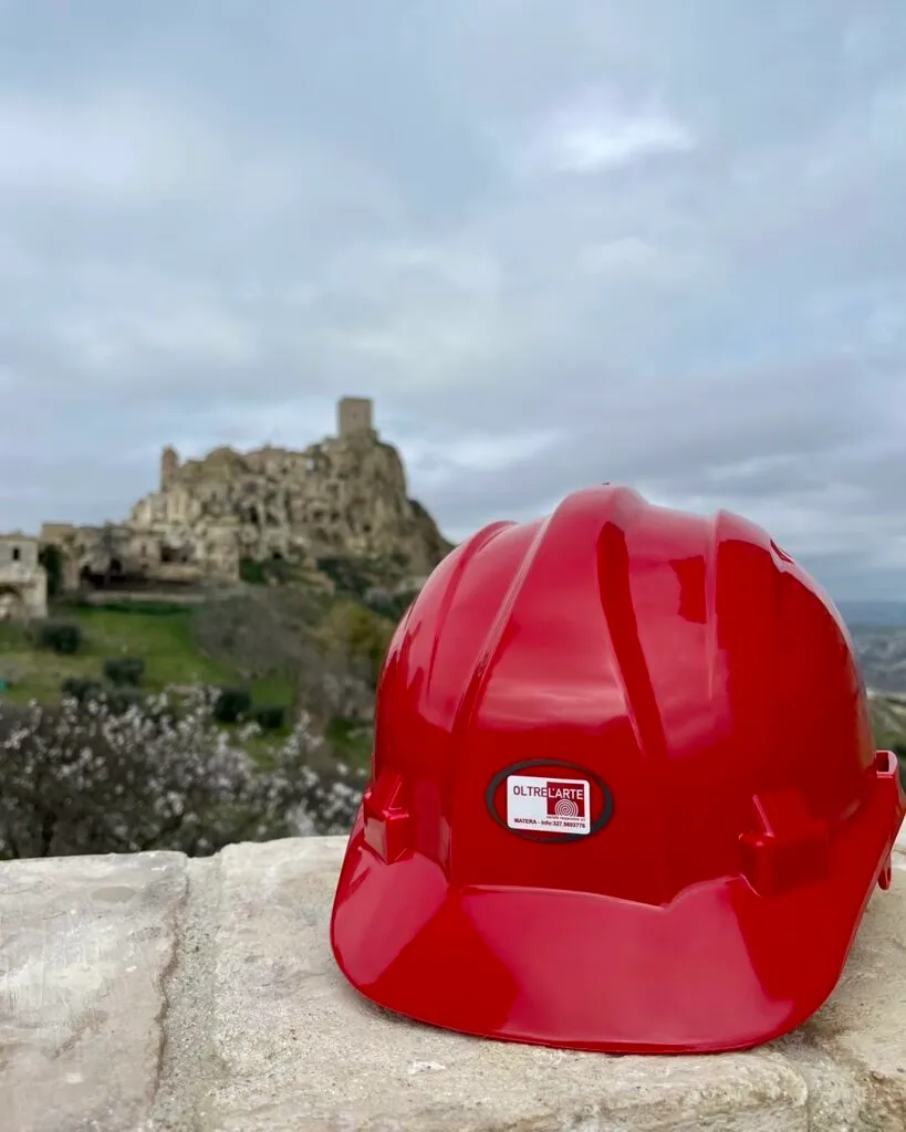 “????????? ?????????? ??????!” dice un post di Instagram della pagina della Coop. Sociale “Oltre l’Arte Matera” recante la foto di un elmetto rosso con il logo della Cooperativa.