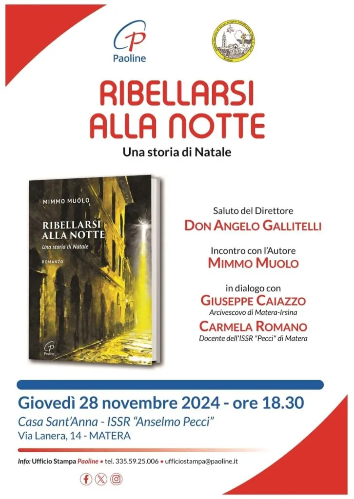 Il volume "Ribellarsi alla notte" di Mimmo Muolo sarà presentato giovedì 28 novembre alle ore 18,30 presso Casa Sant'Anna - ISSR "Anselmo Pecci" in Via Lanera,14 a Matera. Dopo i saluti del Direttore dell'Istituto Don Angelo Gallitelli, l'autore dialogherà con Carmela Romano e mons. Antonio Giuseppe Caiazzo, arcivescovo di Matera-Irsina e vescovo di Tricarico.