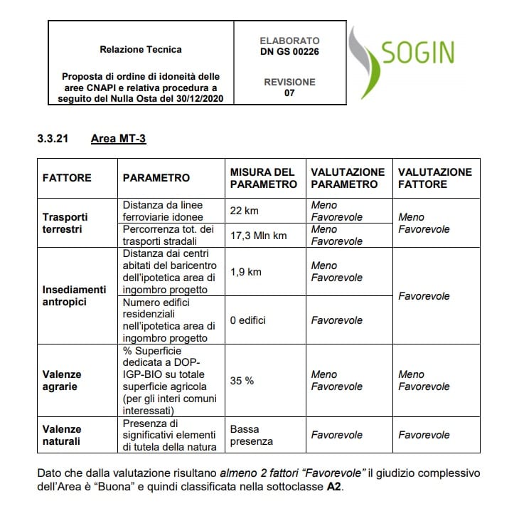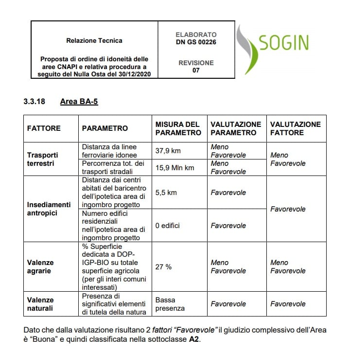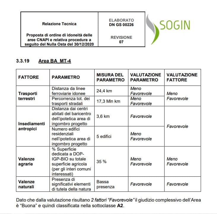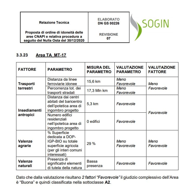 Nelle schede specifiche, allegate alla tabella, si può notare come su queste aree appulo-lucane pesa un giudizio sfavorevole per la ben nota carenza di collegamenti ferroviari e stradali, cosa di estrema rilevanza, evidentemente, nelle complesse modalità del trasporto di materiale come i rifiuti radioattivi.
