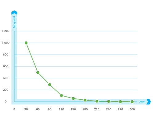 I rifiuti che appartengono alla seconda categoria esauriscono la loro attività entro qualche secolo, in linea di massima in trecento anni. C’è però da considerare che gli isotopi radioattivi hanno particolari tempi di dimezzamento nei quali perdono parte della loro energia. Nel deposito nazionale sarebbero sistemati rifiuti con tempi di dimezzamento non superiore ai trent’anni; ciò significa che già dopo cento anni perderebbero il 90% della loro radioattività iniziale, come nel caso del Cesio-137 riportato nella tabella seguente.