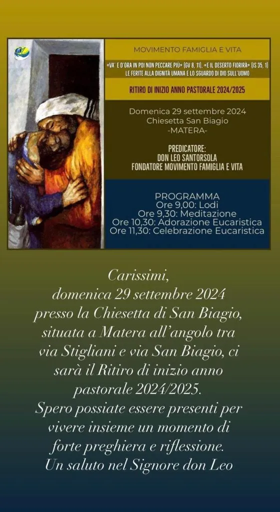 Domenica 29 settembre alle ore 9,00 presso la chiesetta di San Biagio in Matera si terrà un ritiro di inizio anno pastorale del Movimento Famiglia e Vita.