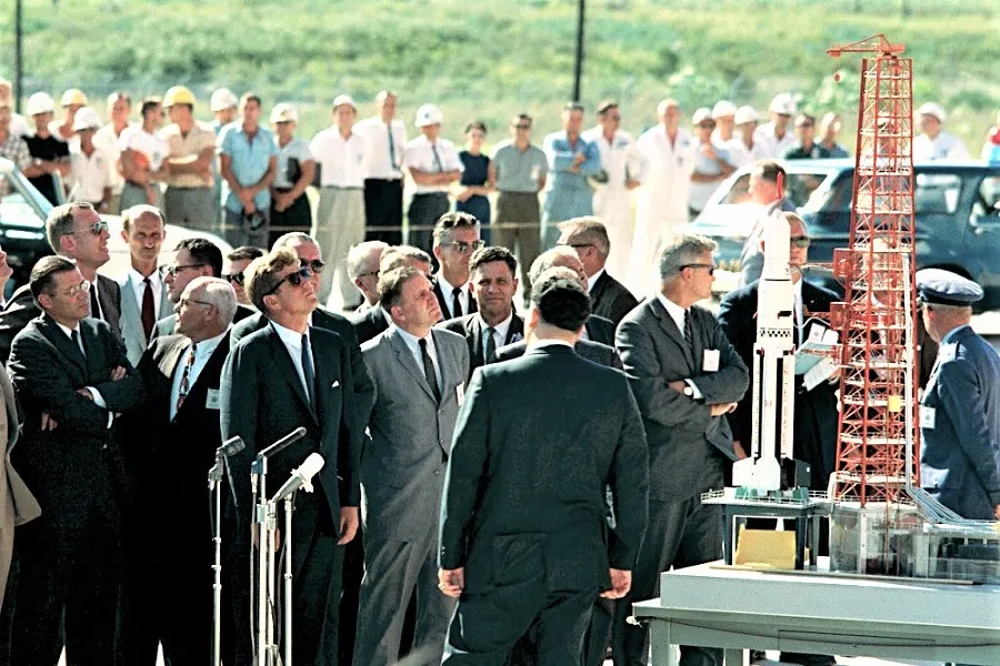 Tra le risorse digitali della NASA siamo riusciti a trovare una fotografia che riprende un uomo di spalle mentre mostra al Presidente degli Stati Uniti J.F. Kennedy il modellino di un missile. La foto fu scattata l’11 settembre del 1962 a Cape Canaveral. Il modellino è una riproduzione in scala del missile Saturn che negli anni successivi lancerà nello spazio le navicelle che porteranno l’uomo verso la Luna.