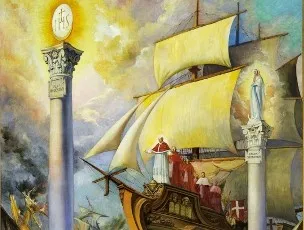 In mezzo all’immensa distesa del mare si elevano due robuste colonne, altissime, poco distanti l’una dall’altra. Sopra di una vi è la statua della Vergine Immacolata, ai cui piedi pende un largo cartello con questa scritta “Auxilium Christianorum”, sull’altra, che è molto più alta e grossa, sta un’Ostia e sotto un altro cartello con le parole “Salus credentium” (salvezza dei credenti).