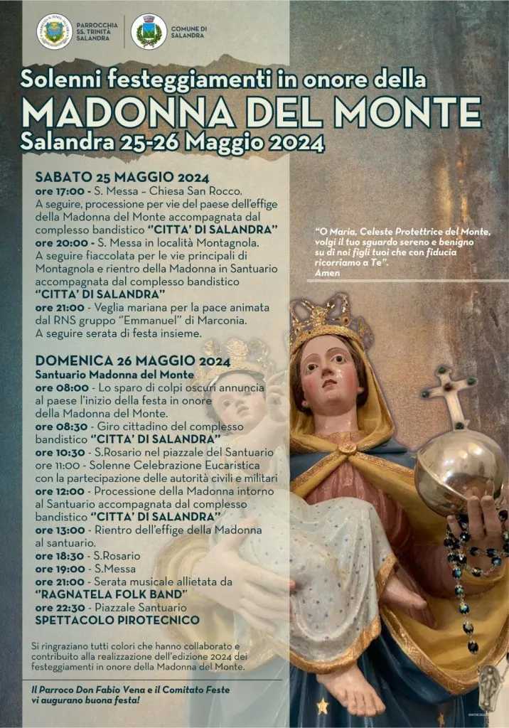 La festa della Madonna del Monte, inizia il primo sabato di maggio, con il tradizionale pellegrinaggio a piedi – che quest’anno la comunità salandrese ha compiuto per la prima volta con don Fabio Vena, suo nuovo parroco – dalla chiesa di San Rocco al Santuario.